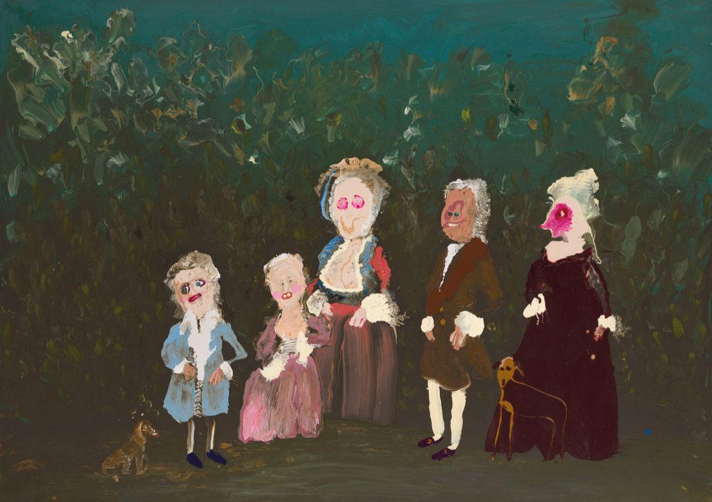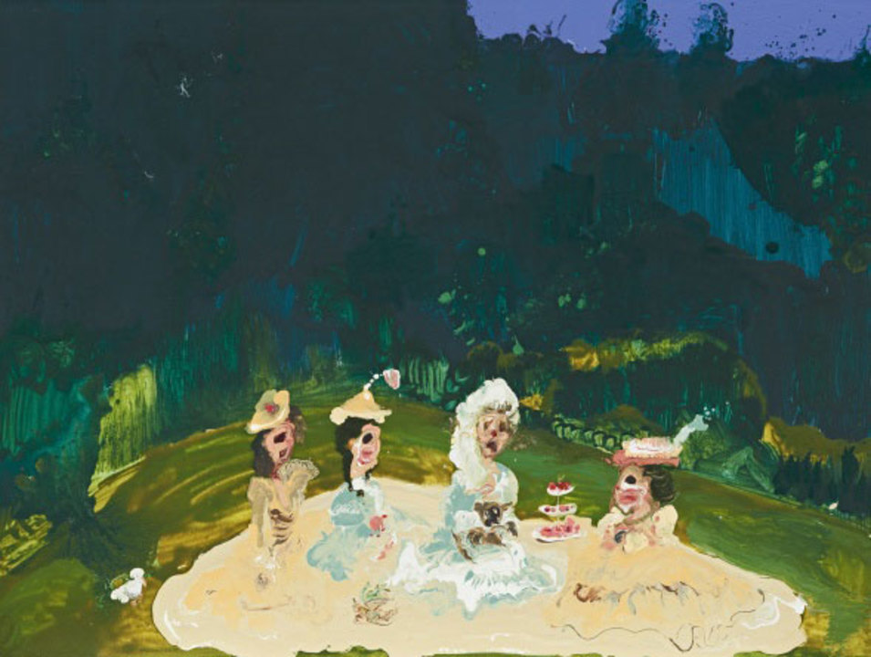 Bowling had commented to Art Market Monitor that it was the “interpretations of art historical masterpieces” by Figgis which had achieved “the most robust results’’ at auction. Her work is inspired by famous painters, including François Boucher, Hans Holbein, James Ensor, Jean-Honoré Fragonard, and Diego Velázquez. Sometimes the homage is direct, with the original image replicated in her idiosyncratic off-kilter and slightly surreal style, such as in The Swing (after Fragonard) (2014) or Olympia (after Édouard Manet) (2018). In Ladies Picnic (Déjeuner sur l’herbe) (2014), she rejected Manet’s original representation of a naked woman picnicking with two dressed men, instead depicting four ghoulish ladies in ornate garb enjoying a cream tea on the lawn. While the image is witty, the provocation is polite, and the perceived feminism remains moderate enough to be accessible to a wide collectorship. Figgis’s practice more broadly riffs on aristocratic social portraiture, often portraying the luxurious and frivolous activities of the bourgeoisie. Her poking of the upper classes is enhanced by her interest in theatrics and the macabre, playfully transforming the refined life of the leisure class into something grotesque or overtly sexualised. The uncanny faces of her protagonists might appear congealed or contorted, with their limbs petering off into tendrils, or their bodies blurring with their environment.