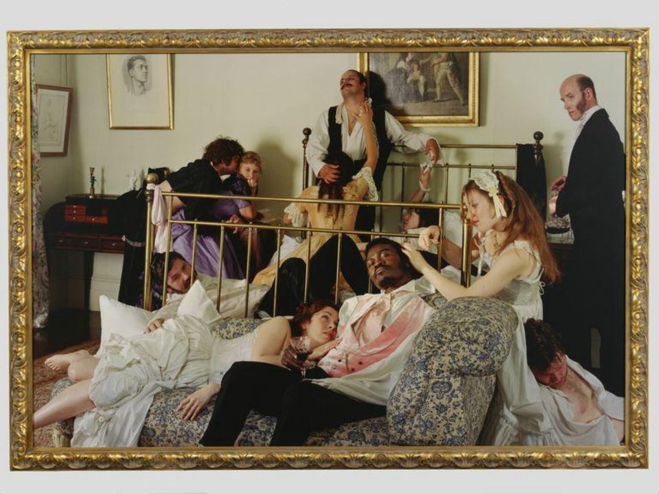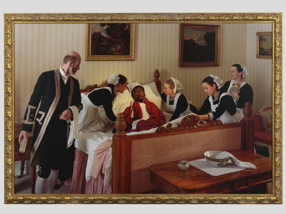 Shonibare’s photographs bear a strong connection to British painter William Hogarth’s The Rake’s Progress, a satirical series of engravings detailing the life of a wealthy and hedonistic man of leisure. Reflecting a broader norm in 18th century England, Hogarth made ample use of racial imagery in his satire, turning his Black subjects into dehumanized objects of humour. Like Hogarth’s series, Shonibare’s work chronicles the moral decline of the dandy but he has reversed the “otherness” of Blackness that formed the core of Hogarth’s racial satire. The dandy is now a multi-layered figure in a way that Black characters were never allowed to be in Hogarth’s work.
