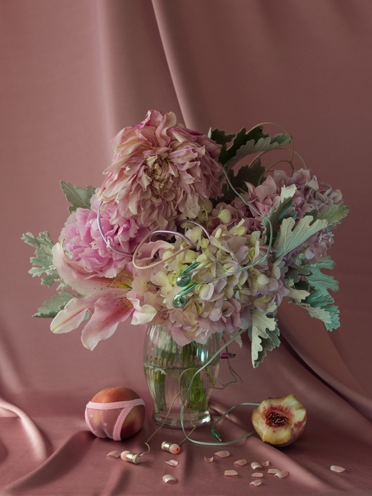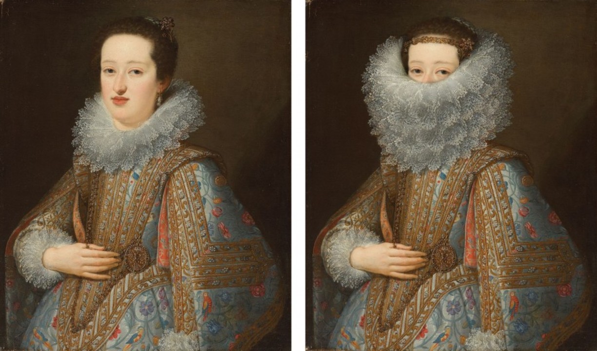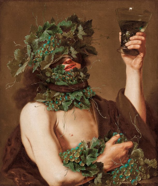 In 2020, Christie’s asked German artist Volker Hermes to reinterpret a selection of pieces from their Classic Week auctions. As part of his Instagram-friendly ‘Hidden Portraits’ series, Hermes used Photoshop to obscure the faces of old master portraits, shifting the viewer’s attention towards the surrounding signifiers of identity: multiplied to excess, a glut of grapes covers the face of Christiaen van Couwenbergh’s (1604-1667) ‘Bacchus’, leaving only the god’s lips visible, while the face of Giusto Suttermans’s ‘Eleonora Gonzaga’ (1621) is masked with layers of ruffs except for her eyes, allowing her to peek at the viewer instead.