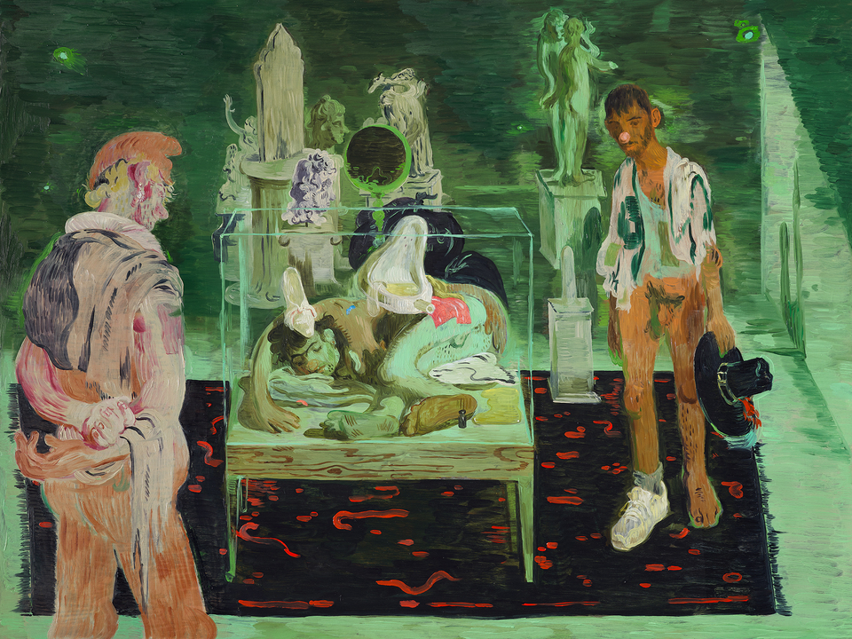Toor, a renowned mid-career artist with a rapidly climbing international presence according to Limna, is known for his tender, narratively-rich figurative paintings, which depict the lives of young, brown, queer men navigating diasporic identities and cosmopolitan culture. Toor’s ‘Museum Boys’ (2021) responds to the “quiet flirtations” in Dutch master Johannes Vermeer’s ‘Officer and Laughing Girl’ (c.1657) and ‘Mistress and Maid’ (c.1666−67). Tinged with an eerie phosphorescent glow, the imaginary allegorical scene in ‘Museum Boys’ portrays an encounter between a ghost-like figure and a dandyish half-naked man, the space between them occupied by a vitrine full of objects and limbs.
