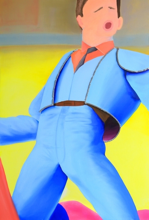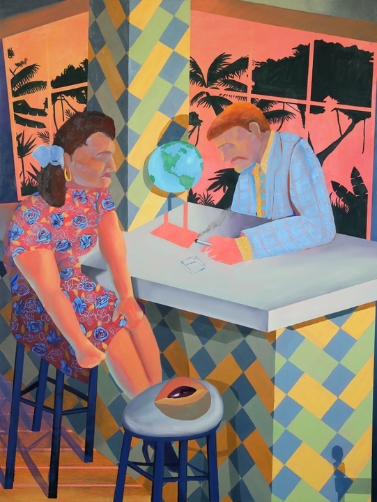 When picking her protagonists, Segovia hones in on “archetypes that point to no individual in particular, but rather a universalised idea of an identity that’s been constructed”. Most of the figures that populate her colourful, spatially ambiguous scenes are stripped of distinguishing facial features, leaving the viewer to examine the other visual and cultural signifiers within the frame – clothing, books, gestures – in order to read the identity being projected. “The idea is to point towards the ‘plasticity’ of these identities, allegorically through paint,” the rising artist expands. “To make the emptiness of these mass produced ideals explicit.”