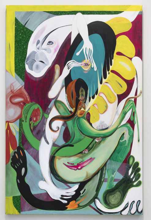 Every element of Sanchez’s paintings acts as a signifier of sorts that speaks to – or against – the cis-gendered, Eurocentric hegemony. At the centre of her practice, she has said, is a desire to explore “how the duality of identity gets concretized in, and by, contemporary culture: the Mexican and American, us and them, the personal and the sociocultural”. How we, as individuals, dissect her visual cues is of equal importance to the artist, a former graphic designer, who “treats the ambiguity of her marks as psychographics: revealing truths about the viewer themselves.”