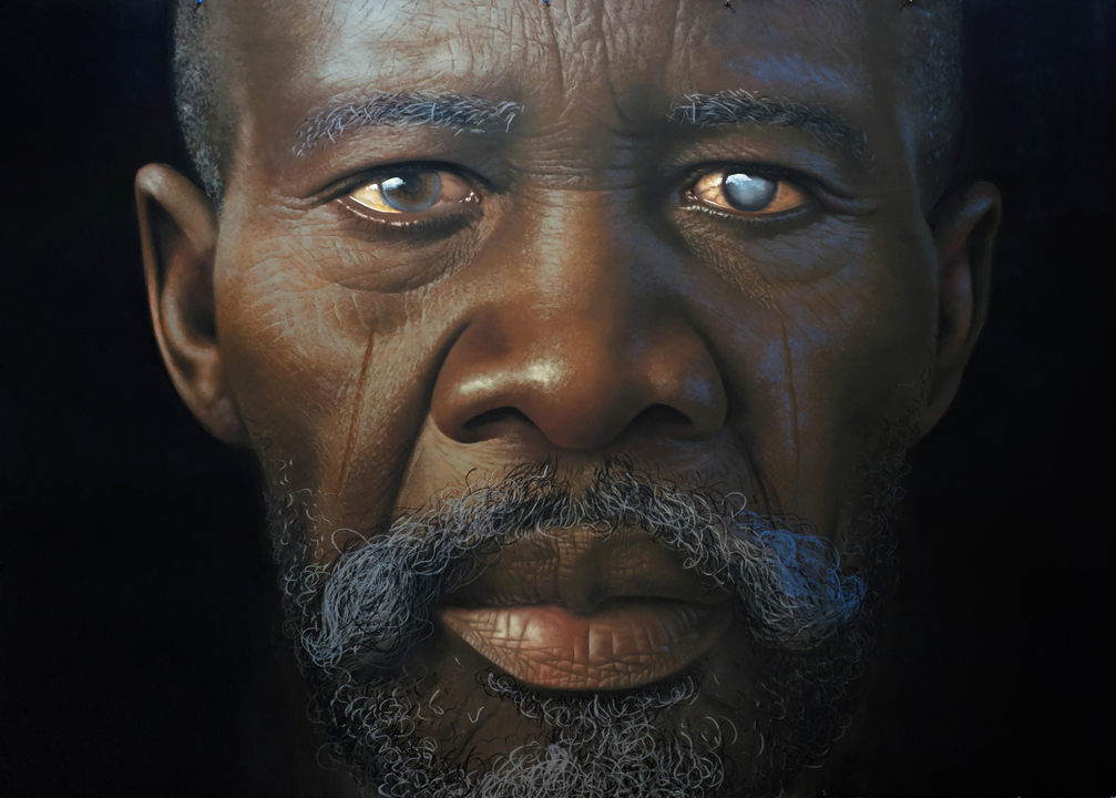 There is nowhere to hide when you confront one of Babajide B Olatunji’s paintings from Tribal Marks III. The ongoing series of charcoal and pastel works on paper depicts up-close faces dominating each frame, their hyper-realistic countenances realised in every detail with unwavering gazes coming straight back at you. With nothing but blackness behind them, you are drawn into a conversation with these personas, both young and old. Everything about them is entrancing, but it’s their scars that make them unique.