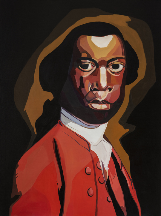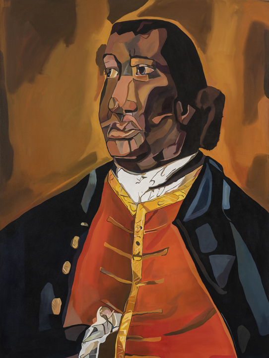 The only available image of Sancho is by Thomas Gainsborough and the paintings of Equiano are disputed. There’s one of a man in a red coat that I thought was him but actually isn’t, which gave me conviction that this was an important show to do. Some of the portraits have been taken from engravings and I’ve made up a portrait of Sancho’s wife. She doesn’t exist in paintings so I wanted to paint what I imagine her to look like.