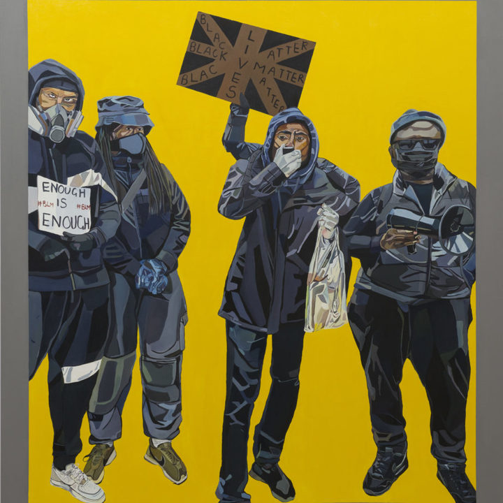 Joy Labinjo has fast become renowned for her large-scale figurative paintings that are distinguished by their use of a flattened perspective and vivid colours to create sculptural compositions, and for their wholehearted celebration of Black communities in Britain. Driven by the lack of representation in art history and history books, she has evolved from reimagining happy, every day moments from her family’s photo albums to addressing race relations, past and present. Yet, regardless of where her sourced images come from, there’s always an arresting warmth to her work that stems from a profound engagement with the importance of belonging.