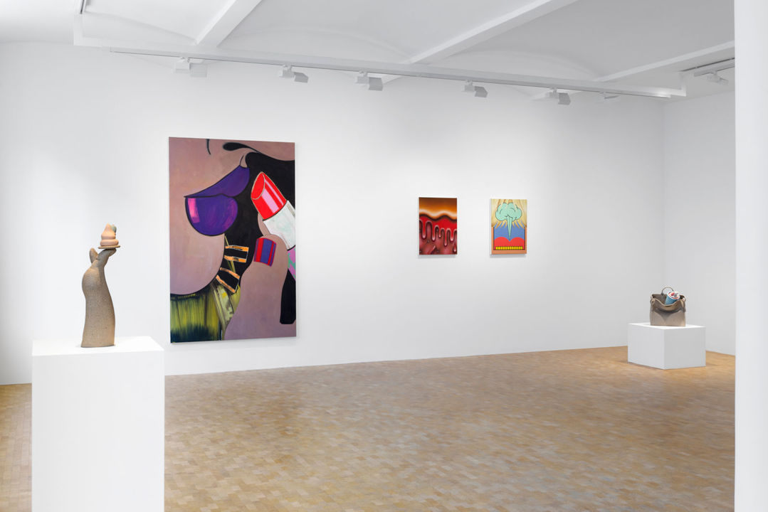 Critic and poet Barry Schwabsky curated a small selection of paintings and sculptures by Genesis Belanger, Ellen Berkenblit, June Leaf, and Emily Mae Smith for a show at Pippy Houldsworth Gallery, which he titled Dark Laughter. In the accompanying exhibition text, Schwabsky wrote that the collective “work arouses dark laughter thanks to their acerbic view of the world we share, and against which they quietly rebel.” Belanger explained that her exhibited sculpture, A Woman Is Always Prepared (2019), was loosely inspired by the political situation in the UK. “It seemed a missed opportunity to not at least acknowledge Brexit. I read about protesters throwing milkshakes at political party members … I thought this was absolutely hilarious and awfully dark. I made the bag (a Fendi Peekaboo bag) with the milkshake imagining a lot of people may feel the impulse to throw a shake at someone during this moment.”